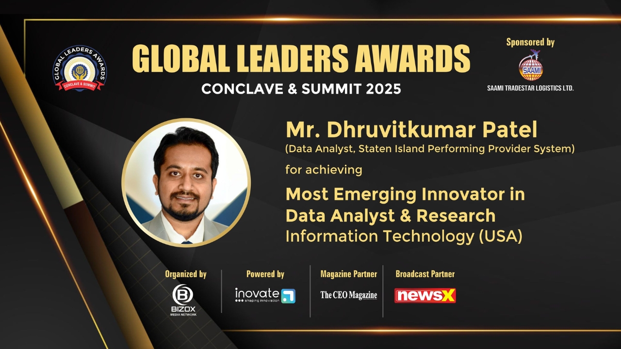Awarded by Bizox Media Network as a “Most Emerging Innovator in Data Analyst & Research – Information Technology (USA)” at Global Leaders awards 2025– Conclave & Summit recently held in Kuala Lumpur, Malaysia.